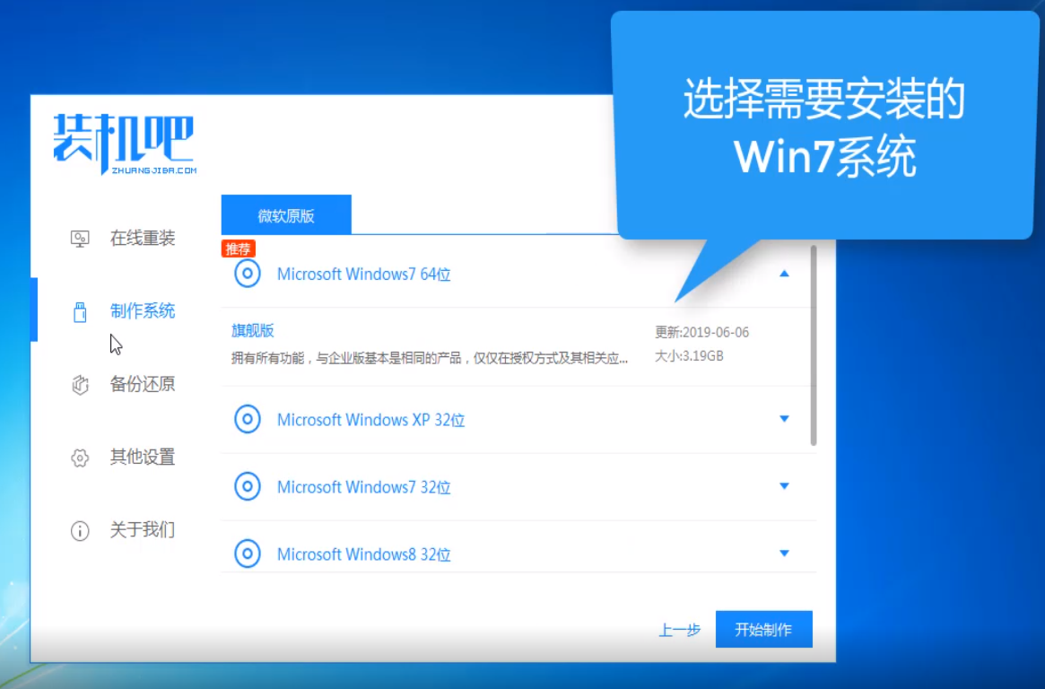 2、装机吧提供多种微软系统,选择电脑需要安装的win7系统,点击左下角的开始制作。