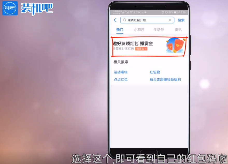 2,在搜索框搜索赚钱红包升级,会出现选项。