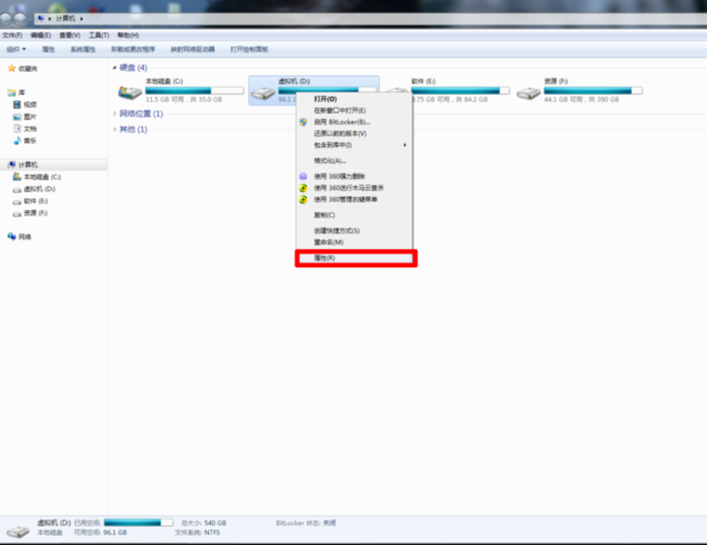 2,首先找到我们需要修复的坏道磁盘,例如:C盘、D盘、E盘、F盘等,然后右击,选择“属性”;详情参考下图