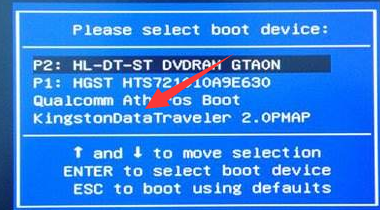 6、之后把U盘插入需要重装系统的电脑,重启电脑或者按下开机键,在出现品牌logo之前不停的敲击之前查询的u盘启动热键,出现的boot选择界面选择U盘选项,回车