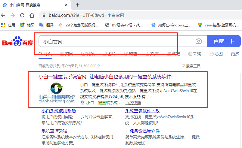 2、打开浏览器搜索小白官网,找到小白官方网站并点击进入。