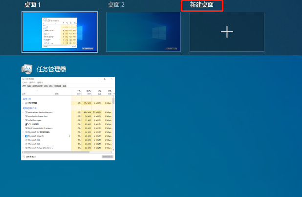 4、或者打开任务管理器,之后按win+Tab打开多桌面功能,之后点击新建桌面。