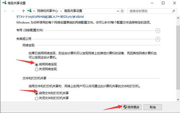 7、点击勾选“启用网络发现”和“启用文件和打印共享”,点击保存设置按钮。