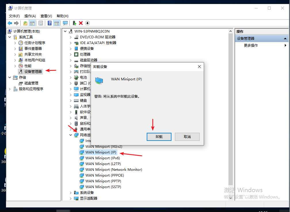 6、接着我们选择网络适配器,找到WAN Miniport(IP)右键选择卸载设备,卸载之后,重启电脑即可。
