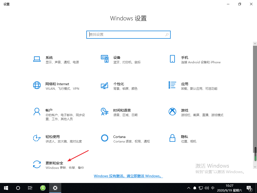 1、首先我们打开左下角的开始按钮,点开设置页面,选择更新和安全按钮。