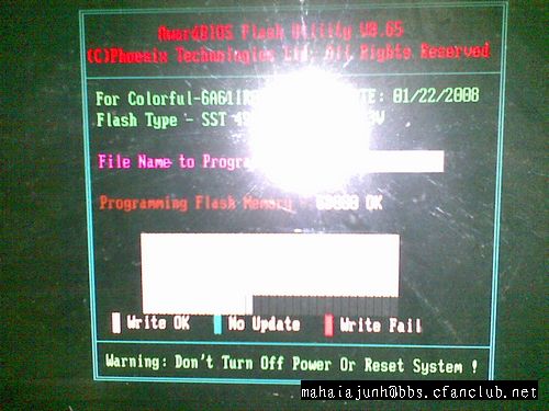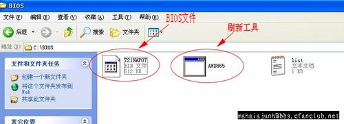 XP系统进DOS,安装个矮人DOS工具箱,或者MAXDOS工具箱,矮人DOS没装进去,后来改用MAXDOS。 重启 进入DOS系统: 在出现系统选择界面的时候,按键盘下方向键选中MAXDOS 第一项回车 最后一项回车 现在进入DOS了,进入C盘,DIR红圈中看到了吧,BIOS文件夹 cd :\bios 运行刷新工具awd865.exe 进入awdflash 输入新的BIOS文件名,也就是刚才放在C盘BIOS里的文件。注意加后缀 保存原BIOS的文件名输入一个,然后YES 确认写入YES回车。 正在写入,不能停机啊!!! 完成后F1重启OK ,进系统 PS:此时还是挺担心的,一不小心偶花了1K买来的九段玩家就废了C盘BIOS文件夹下面多了一个文件,就是我们刚才备份的BIOS文件