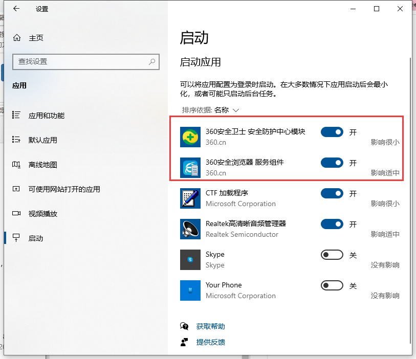 4、在右侧的启动应用页面中就可以看到当前开机自启的应用,点击右侧的开关就可以将应用打开或关闭启动项了。