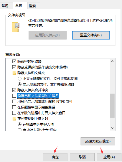 4、将“隐藏已知文件类型的扩展名”前面的勾选去掉。
