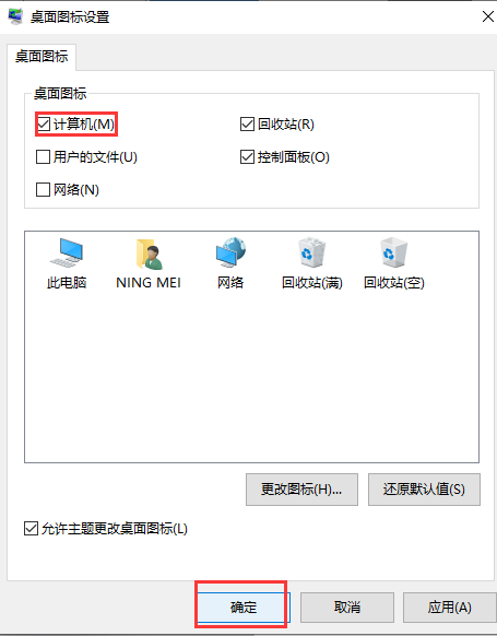 4、在如图示位置,将“计算机”勾选,然后点击“应用”--"确定"。