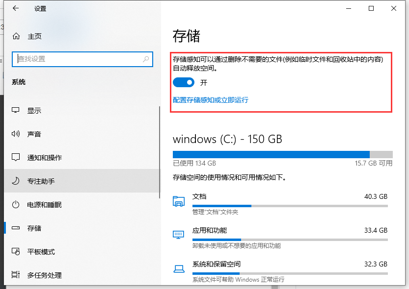 2、然后在系统里面选择存储存储感知开启,然后点击释放空间方式