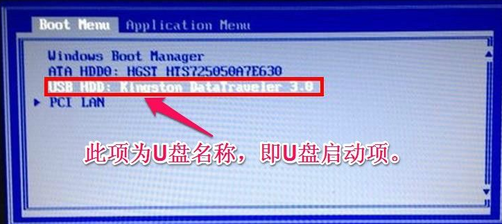 2,会显示出一个启动菜单,在显示的启动菜单中,将光标移动到图中红框选中的项,然后按Enter键确定,即可进入U盘。