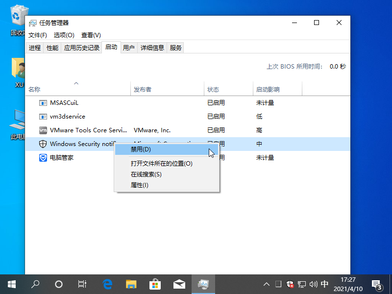4、对着任务栏打开 Windows 任务管理器,在启动选项中找到 Windows Security 这个通知右键禁用掉,这样再下次重启电脑的时候右下角就不会有 Windows 安全中心图标啦。