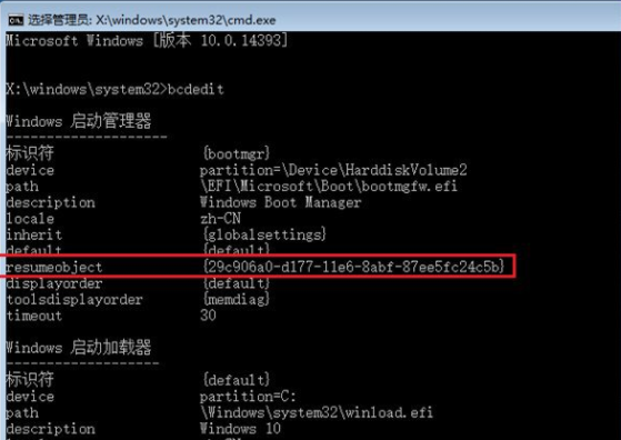3、在命令提示符中输入“bcdedit”(不含引号,下同),找到名为“resumeobject”的选项,记录下后面的一长串字符(即GUID)。