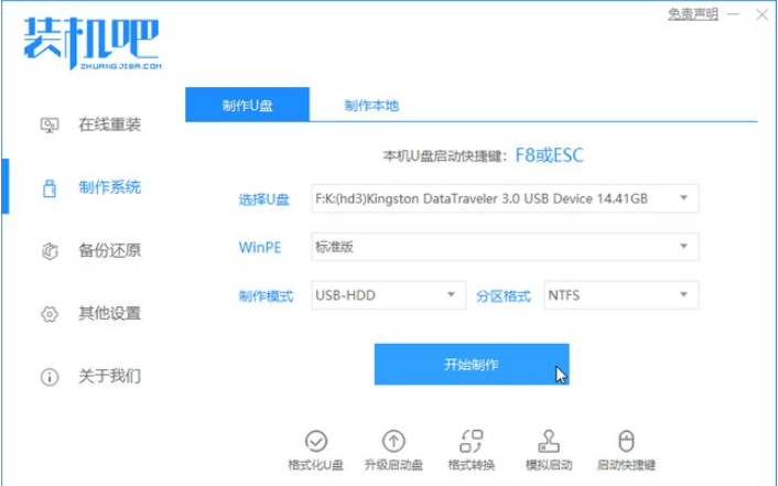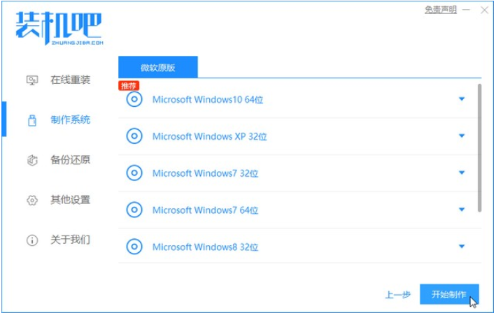 2.进入[装机吧]的主界面,在左侧列表中选择[制作系统],然后单击[开始制作]按钮。
