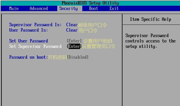 Security安全设置:在这里可以设置BIOS密码等,普通用户只要在系统中给自己的帐号添加登录密码就可以了,不必在这里设置密码。在新出的Win8和Win10电脑中,这里会有一个安全启动选项,需要关闭了才能给电脑安装Win7系统。