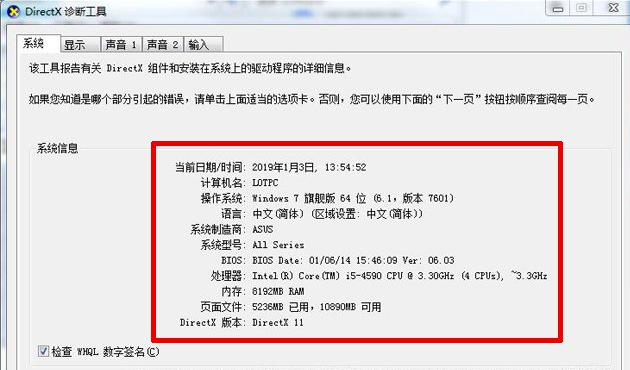 2、这时我们打开了DirectX诊断工具,我们可以看到系统版本,处理器型号、内存容量等。