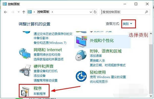 2、打开控制面板,点击“程序”。tips:查看方式选择为“类别”。