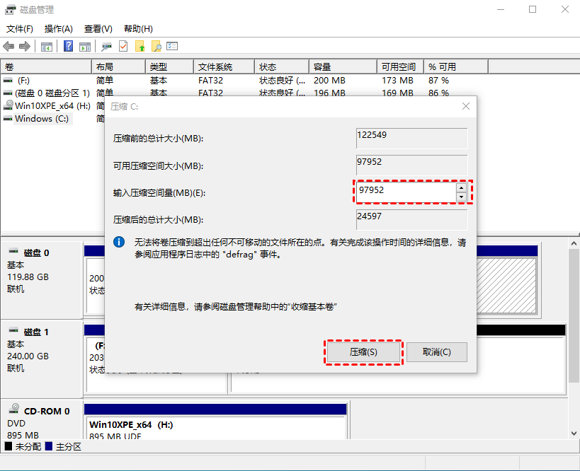 2、右键单击选择要压缩的磁盘(本例选择C盘),选择“压缩卷”在输入压缩空间量(MB)里填写要压缩出的空间量,如果要压缩出100G,就填写100*1024=102400,选择"压缩"按钮。