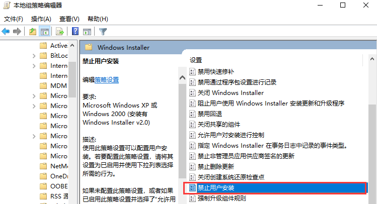 5.进入页面后,我们找到”禁止用户安装“。