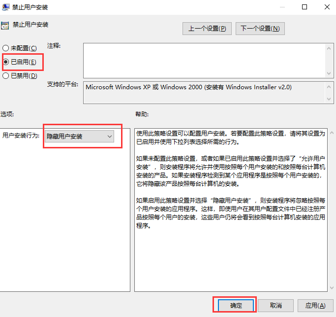 6.在弹出的窗口中,我们勾选”已启用“并打开”隐藏用户安装“按钮,最后点击”确定“即可。