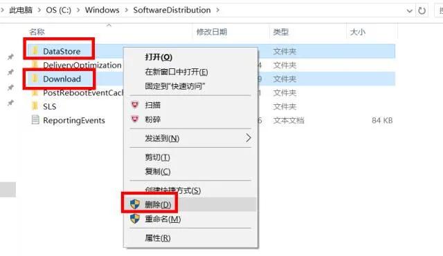 CD %windir%\SoftwareDistribution 命令并回车,这时便进入了SoftwareDistribution文件夹。直接打开“C:\Windows\SoftwareDistribution”文件夹,删除其中Download和DataStore文件夹中的所有文件。