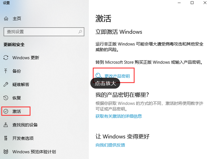 3、在激活设置页面,我们找到“更改产品密钥”,并点击打开它;