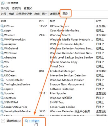 2.在任务管理器页面中,我们打开“服务”页面,单击“打开服务”按钮。