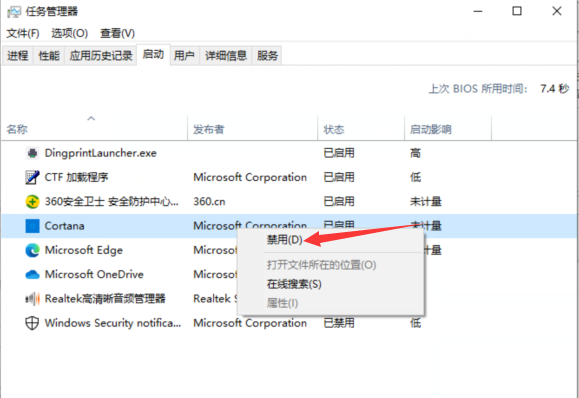 3.在任务管理器中,找到我们打开网站时弹出的广告,右键点击“禁用”即可。