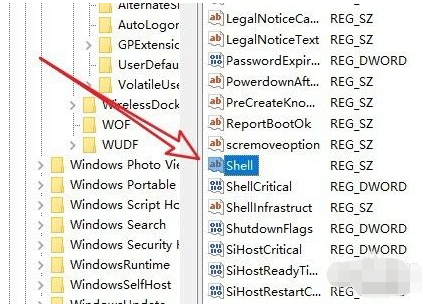 6.在右侧的窗口中找到“Shell”的注册表键值。