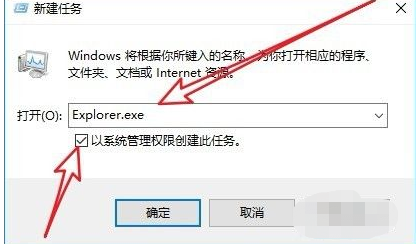 3.然后在打开的新建任务窗口中输入Explorer.exe,然后勾选下面的“以系统管理权限创建此任务”前面的复选框,最后确定按钮即可。看一下现在是否有图标显示出来,如果没有的话,继续下面的操作。