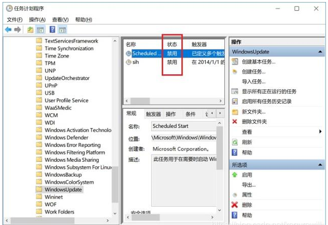 9、之后在任务计划程序的设置界面,依次展开 任务计划程序库 -> Microsoft -> Windows -> WindowsUpdate,把里面的项目都设置为 [ 禁用 ] 就可以了。