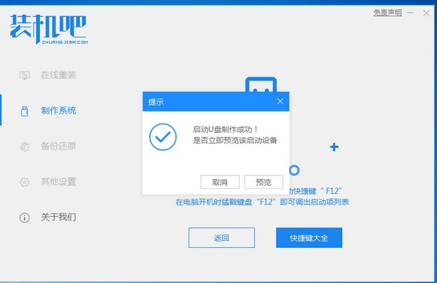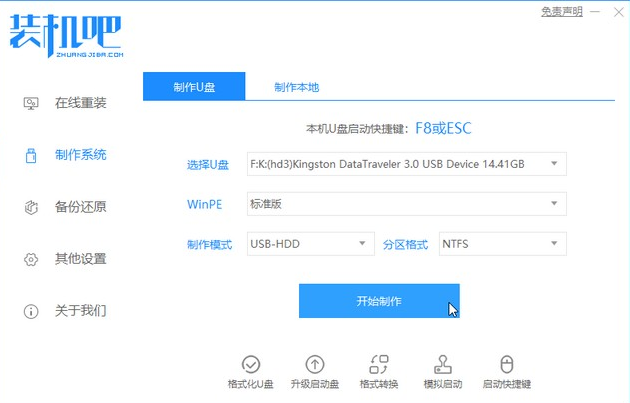 1.下载并安装装机吧一键重新安装系统软件并打开。制作8GB以上的U盘。然后选择U盘,其它参数默认即可。