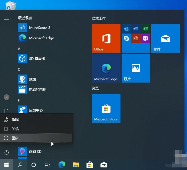 1.启动菜单,找到电源选项,按住Shift键不放,再按重新启动。