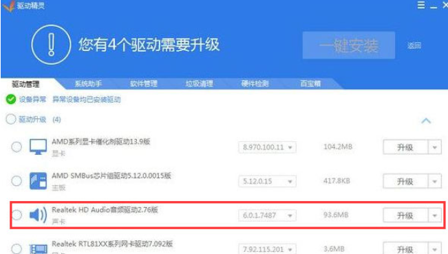 5、系统检测完成后,会显示选需要升级的设备驱动,我们点击安装需要的声卡驱动程序,等待修复完成即可。