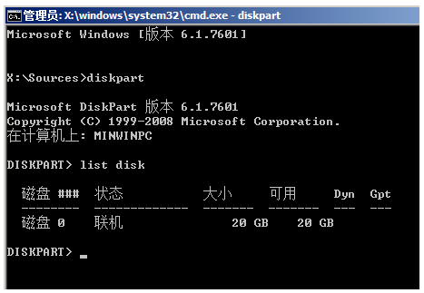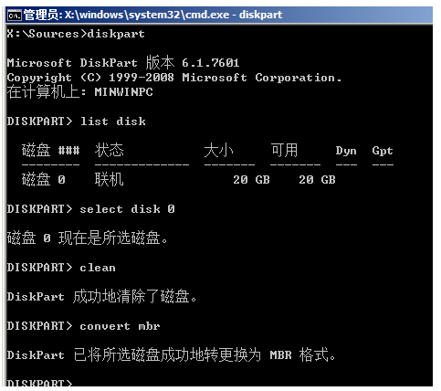 6、输入:convertmbr,回车。将当前磁盘分区设置为Mbr形式。