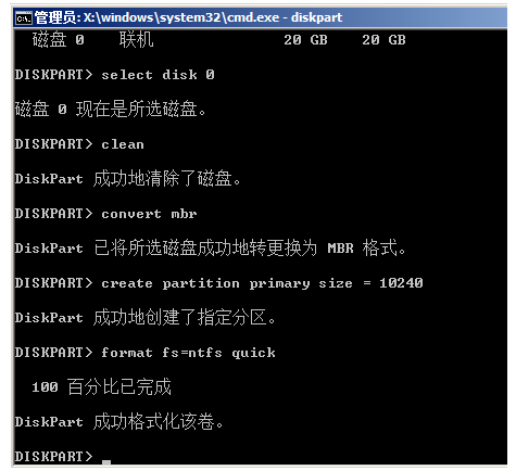 7、输入:createpartitionprimarysize=xxx,回车。创建主分区大小(MB)。