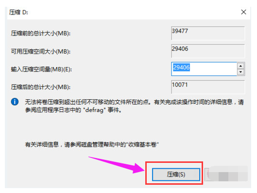5.系统会计算出可以压缩空间,输入你需要压缩空间,然后点击:压缩。