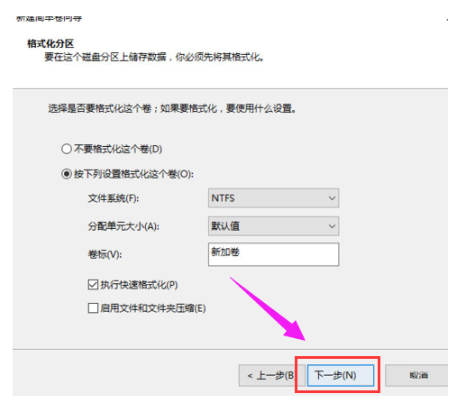 9.为新建的简单卷选择磁盘的格式,一般选择“NTFS”就好了