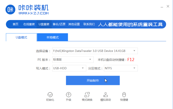 1、搜索下载安装好的咔咔装机一键重装系统工具并打开,准备一个 8GB 以上的空白 U 盘,然后选择u盘模式开始制作启动 U 盘。