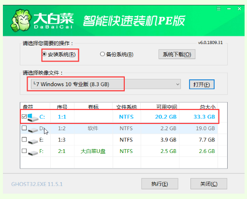4、 打开大白菜装机软件,在“映像路径”中选中镜像文件并选择win10系统安装位置,通常情况下都是C盘,最后点击“执行”。