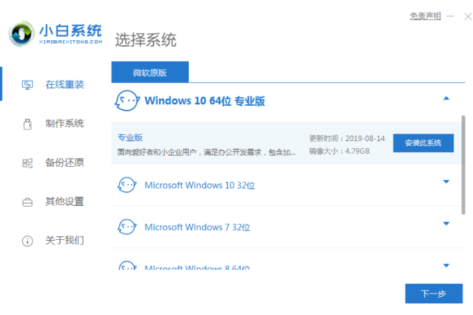 1.打开软件,选择需要安装的win10系统。(内存选择超过4g的64位系统)