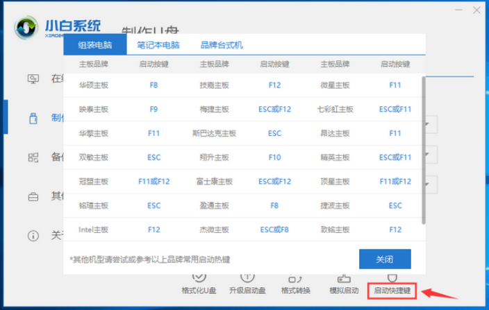5、查找电脑的u盘启动热键。小白一键重装系统内提供启动热键查询,也可以通过网络进行查找。