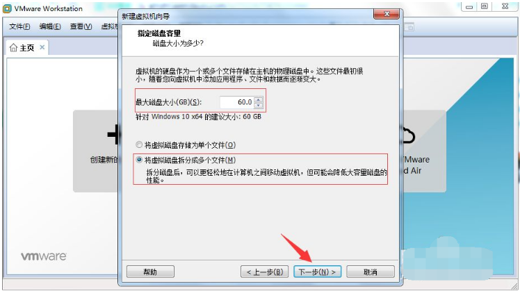6、设置硬盘大小,一般按照默认设置来即可,然后下面的选择第二个,点击下一步。