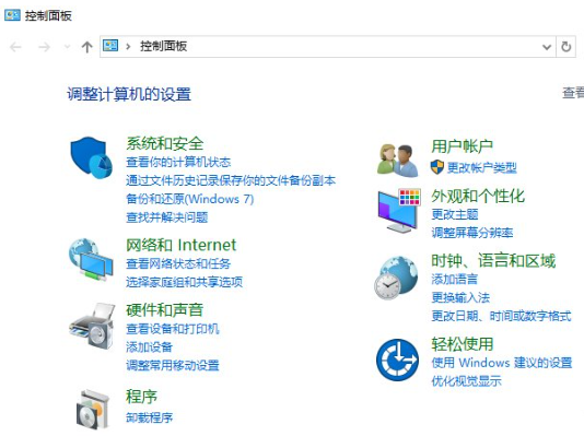 2、点击“控制面板”选项后,这个时候系统会打开的“控制面板”对话窗口。如图所示: