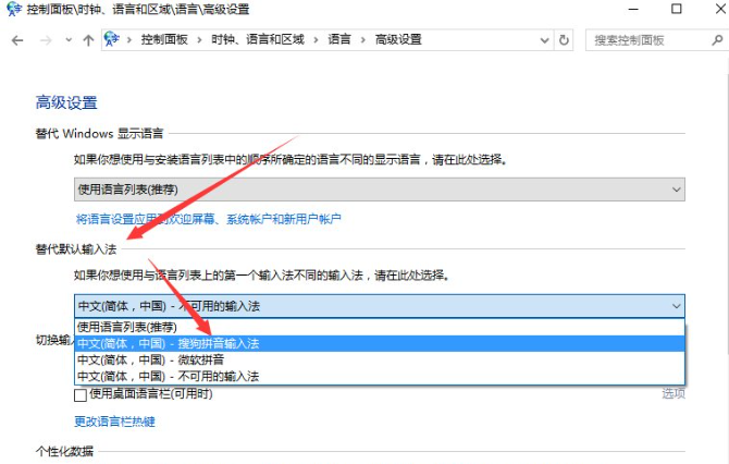 5、在高级设置对话窗口中,找到“替代默认输入法”项,默认是“中文(简体,中国)-不可用的输入法”。如图所示: