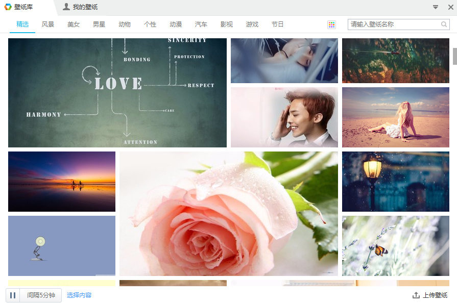 4.在“桌面管理”界面,可以挑选和设置自己喜欢的桌面壁纸,同时可以对桌面壁纸进行一些个性化设置:自动更换和上传壁纸等。