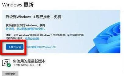 4、如果电脑满足win11的要求,那么点击“下载并安装”即可进行升级。