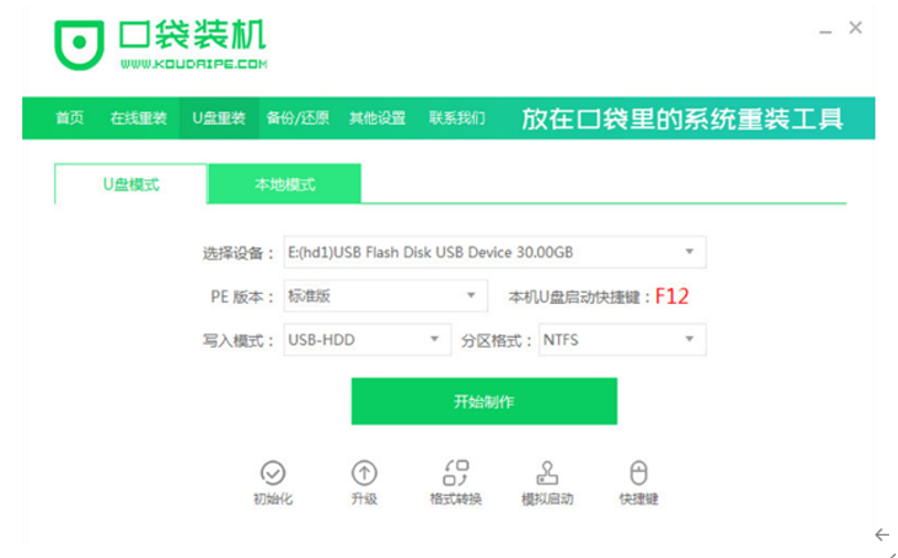 1、用电脑浏览器搜索口袋装软件,下载,安装,打开。点击制作U盘,选择要制作的系统,点击开始制作。
