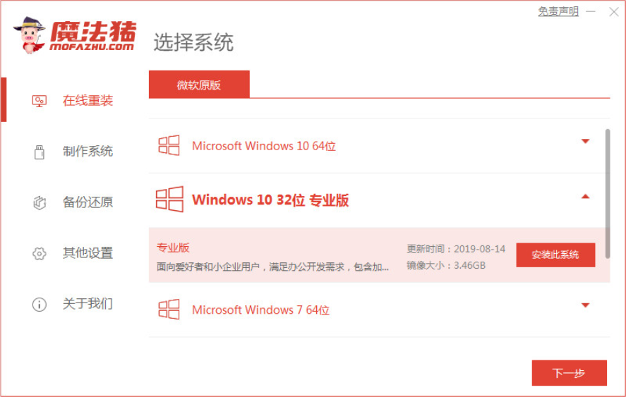 1、下载安装魔法猪一键重装系统软件打开,选择需要的win10系统进行安装。