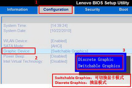 2、进入bios setup主页面,选择configuration选项,用↑↓键移动光标到graphic device选项按回车键,然后在弹出的小窗口中有两个选项,switchable graphics表示可切换显卡模式,discrete graphic表示独显模式。选择一个要设置的选项按回车即可,如图: